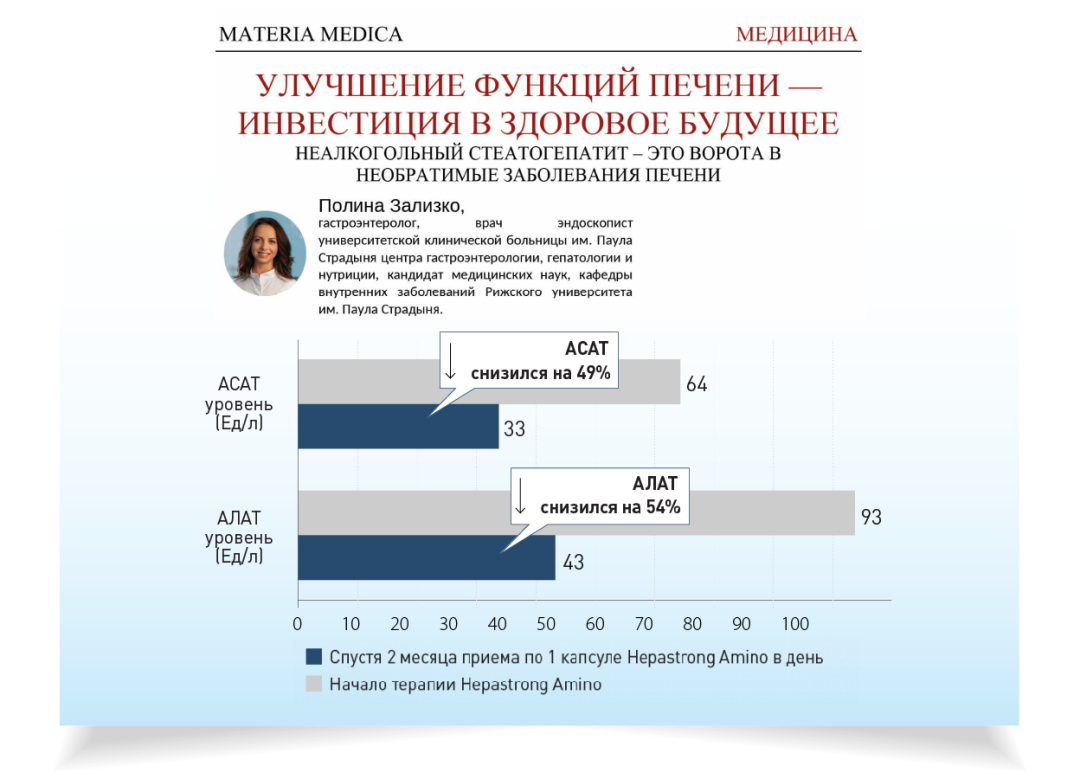 В 2018 г. проводилось наблюдение, длившееся 2 месяца, под наблюдением гепатологов и семейных врачей. За время наблюдения пациенты с повышенным уровнем АЛАТ и АСАТ принимали Hepastrong Amino по 1 капсуле в день.